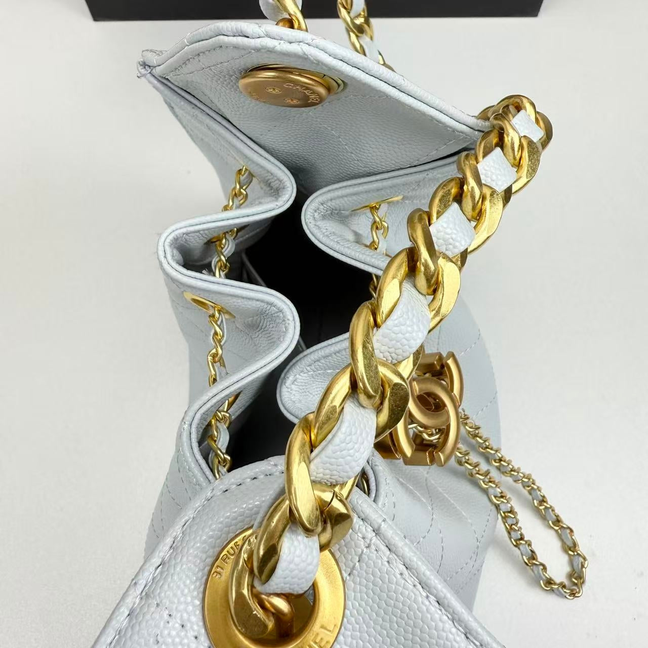 - Sophisticated Chain Strap – Sturdy gold-tone chain intertwined with leather for a chic and eye-catching finish.